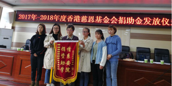 资源与环境工程学院学生代表向香港慈恩基金会代表献上锦旗