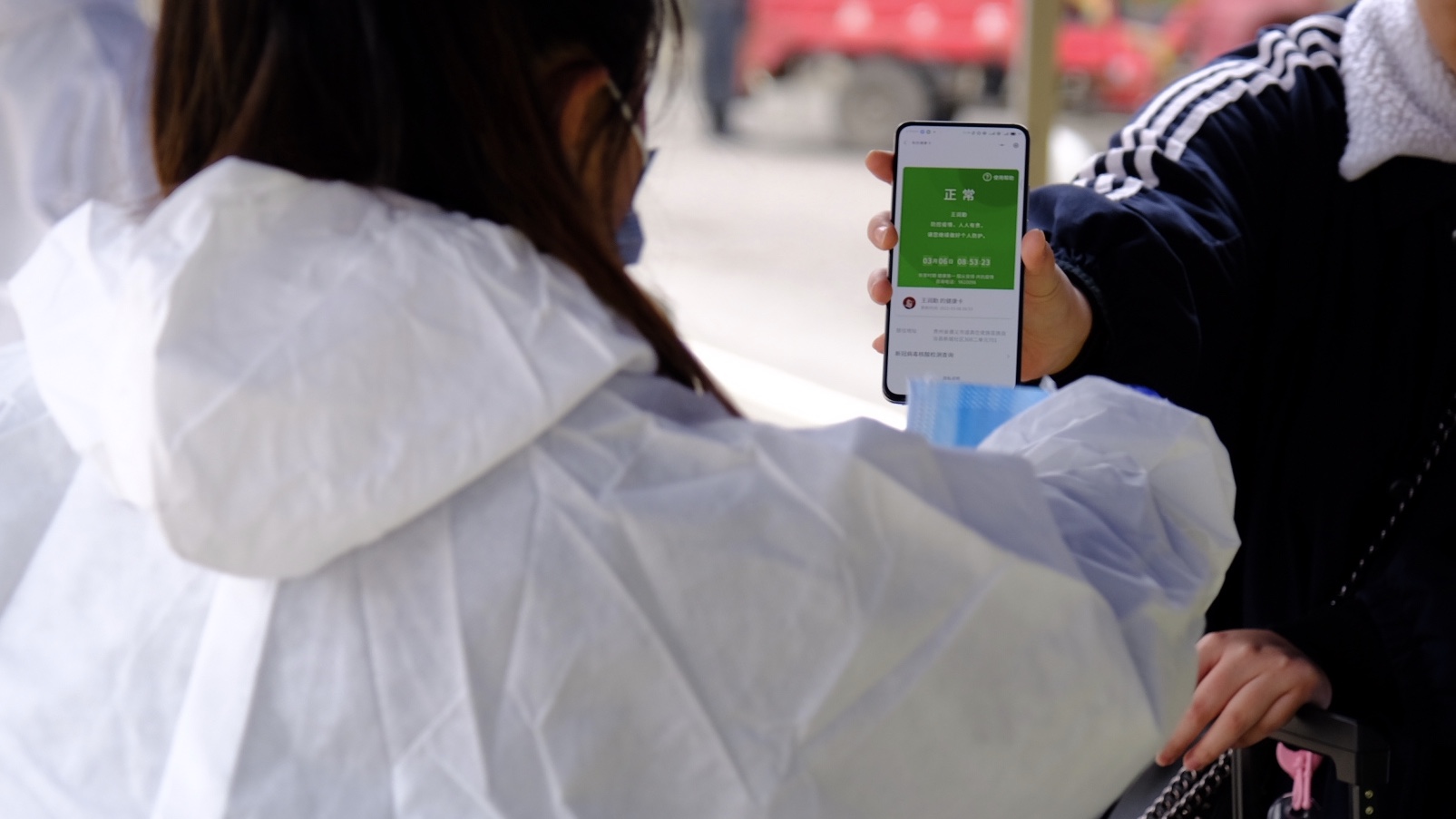 在校门口,返校学生完成行李消杀、体温检测、身份核验、扫码等程序后,有序报到进校。