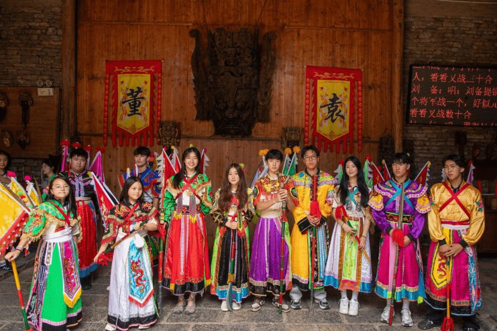 实训室,在安顺古城与王若飞故居探寻历史,感悟红色文化;在天龙屯堡,屯堡孃嬢的花灯调与竹竿舞感染了他们,在天龙学堂描红地戏面具,在演武堂感受明代军傩的刚健豪劲;走进