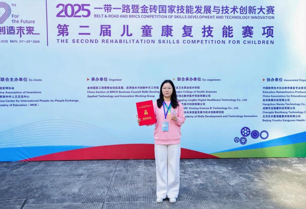 2025年11月21日至23日,2025“一带一路”暨金砖国家技能发展与技术创新大赛第二届儿童康复技能赛项在宁波卫生职业技术学院成功举办。 特殊教育学院2023级特殊教育专业2班学生吴昌蓉在比赛中凭借出色的专业综合能力,荣获孤独症赛道本科组全国三等奖的佳绩,充分展示了学校在应用型康复人才培养方面的能力。