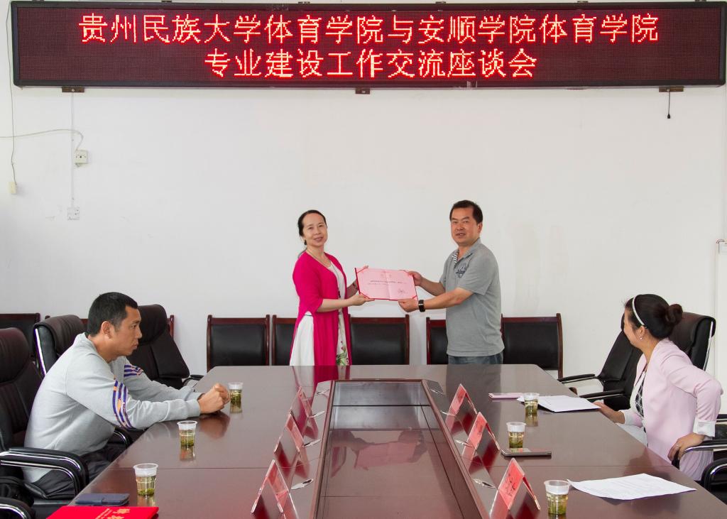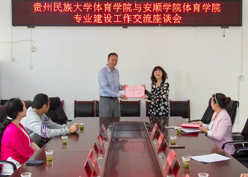 座谈会上,双方就专业建设、体育教育专业综合改革、民族传统体育、场地器材管理等方面工作进行了深入交流。在交流座谈会上,体育学院院长邓文红教授、党总支书记孙黔为体育学院客座教授陈强、黄咏两位学者颁发聘书,聘请他们为体育学院客座教授。