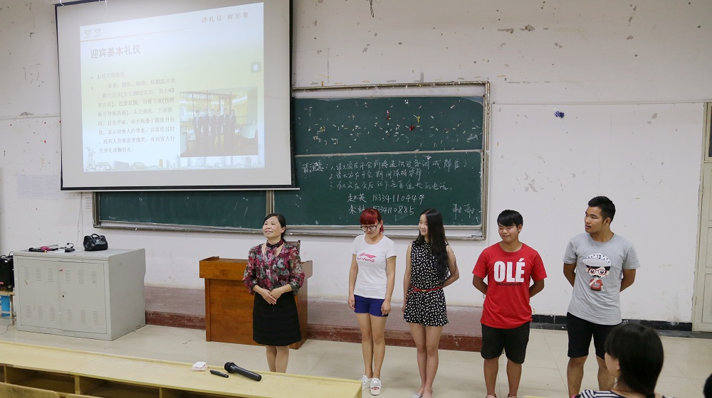 培训会上,赵伶俐书记围绕本次活动开展的背景、志愿服务的要求、基本礼仪知识三个方面,阐述了此次旅游发展大会落点在安顺的原因及好处、志愿者礼貌用语要求、禁忌以及迎宾基本礼仪等。在讲解文明礼仪的过程中,赵书记请几位同学分别展示了男士、女士的标准站姿,师生互动良好,现场气氛融洽。