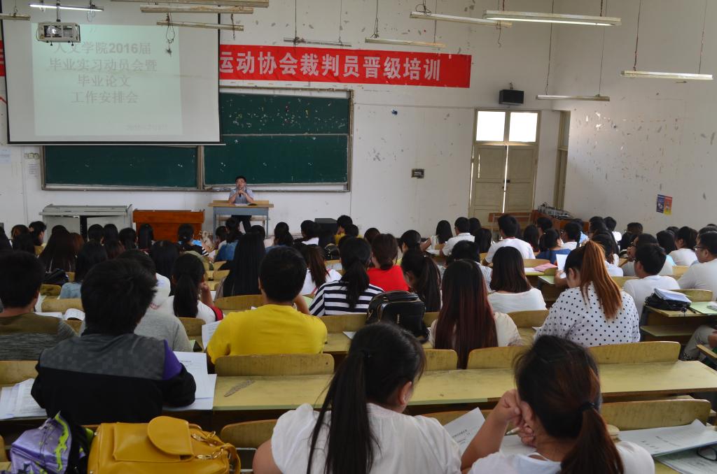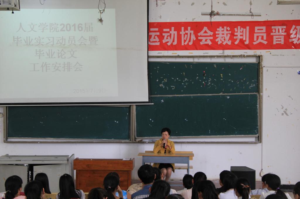 2015年7月9日下午,人文学院在A11教室召开了2016届毕业实习动员会暨论文工作安排会。人文学院院长雷鸣,副院长杜志明、伍薇薇,人文学院部分教师以及2016届全体毕业生参加此次会议。会议由人文学院副院长伍薇薇主持。