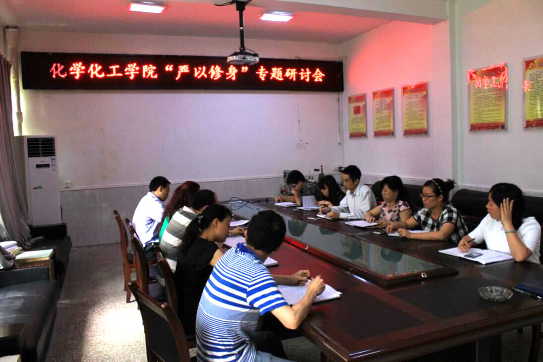 2015年7月14日,按照我校关于开展“三严三实”专题教育的部署要求,化学化工学院领导班子在学院会议室开展了“严以修身”专题研讨会。会议传达了校党委“严以修身”专题学习研讨会实施方案精神,并结合化学化工学院发展实际,围绕“严以修身,加强党性修养,坚定理想信念,把牢思想和行动的总开关”主题进行了研讨发言。化学化工学院党总支书记杨莉莉、院长李琳、副院长张玉波、副院长张红霞及全院教师党员参加了此次专题研讨会。此次研讨会由杨莉莉书记主持。