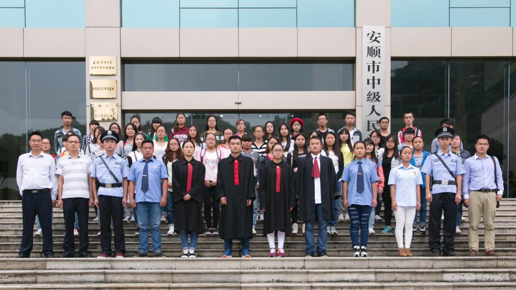 贵州电视台摄制组冒着毛毛细雨不辞辛劳拍摄外景和模拟庭审现场。安顺市中级人民法院政治部杨帆主任、申主任、刑事审判第一庭副庭长黄云庆等领导及法官为政法学院拍摄模拟法庭审判提供法官袍、检察官制服、书记员制服、法警制服、律师袍,并在录制现场进行指导与帮助。