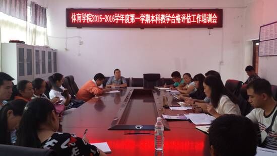 8月28日中午,体育学院2015-2016学年度第一学期本科教学工作合格评估培训会在体育学院会议室召开。体育学院副院长刘宁、林金茹以及全体教师参加会议。会议由体育学院院长邓文红教授主持。