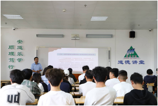 经济与管理学院党委专职副书记周彰波主讲,经济与管理学院学生现场聆听学习。