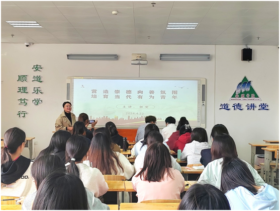 为提高学生的道德水准、文明素养及道德实践能力。2024年4月22日下午, 道德讲堂开展“营造崇德向善氛围   培育当代有为青年”专题讲座。教育科学学院党委专职副书记、党委统战委员郭雯老师主讲,教育科学学院学生聆听学习。