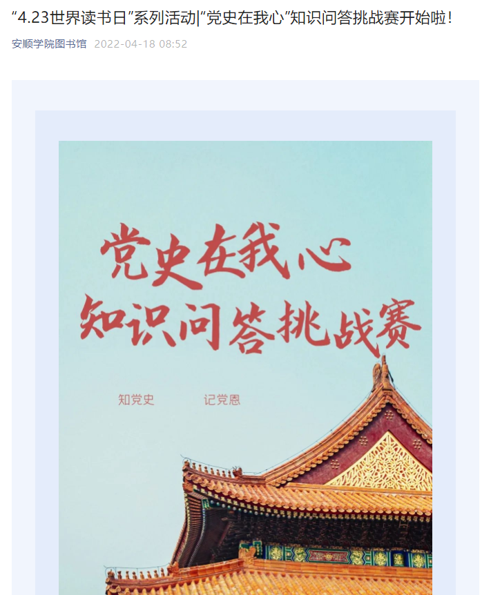启动“4.23世界读书日”系列活动,整个系列活动分为线上和线下两种方式开展,整个活动持续到5月底结束。其中,线上活动共分为“挑战杯”全国大学生信息素养技能大赛、