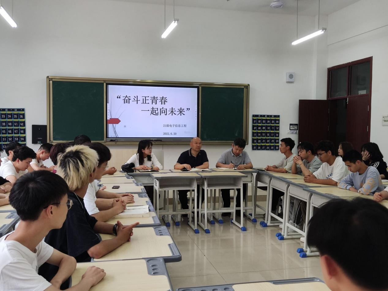 2022年6月20日下午,物电学院2021级电子信息工程班在顺理楼教室召开“奋斗正青春,一起向未来”主题班会。