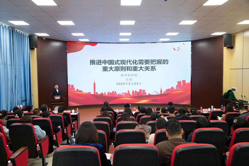 第三届全国高校思政课教学展示活动一等奖获得者贵州商学院汪浩老师以《推进中国式现代化需要把握的重大原则和重大关系》为主题作发言