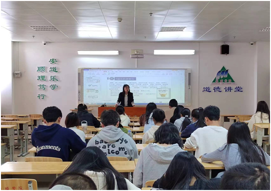 为鼓励同学们做新时代诚信好青年,2024年4月8日下午, 道德讲堂开展“大学生诚信意识的培养和实践”专题讲座, 政法学院团总支书记潘桂芳主讲,政法学院学生聆听学习。