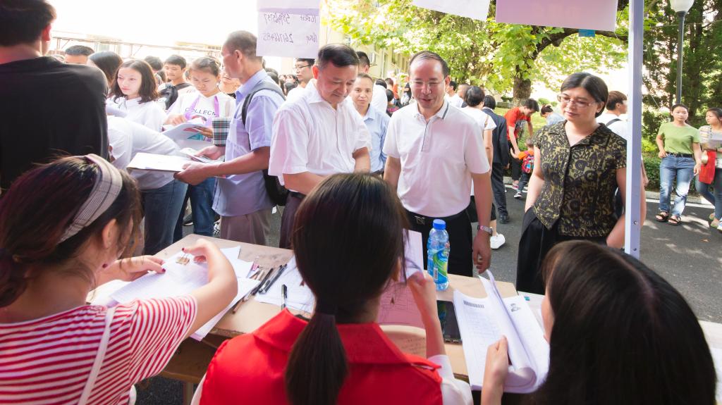 党委书记罗荣彬、院长吴次南走访迎新现场,亲切看望前来报到的新同学和家长,并慰问参加迎新工作的教职工和学生志愿者。