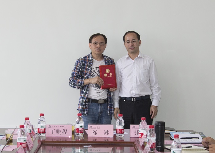 党委书记罗荣彬(右)为安顺籍博士、工作站站长程洪兴(左)颁发聘书