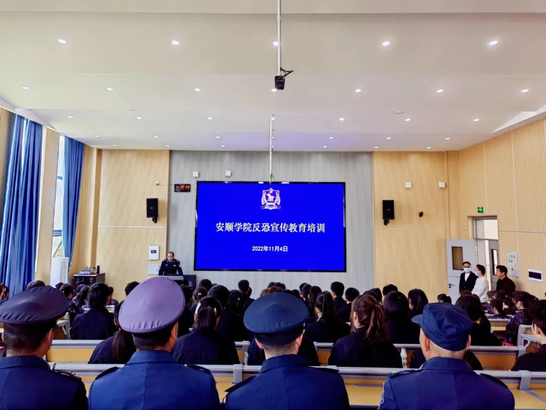 在安道楼组织开展“反恐宣传教育培训”活动。安顺市反恐办副主任、市公安局反恐支队支队长汤锡勇受邀进行宣讲,我校保卫处工作人员、护校队成员,义务消防队成员,物业管理人员等参加此次培训。