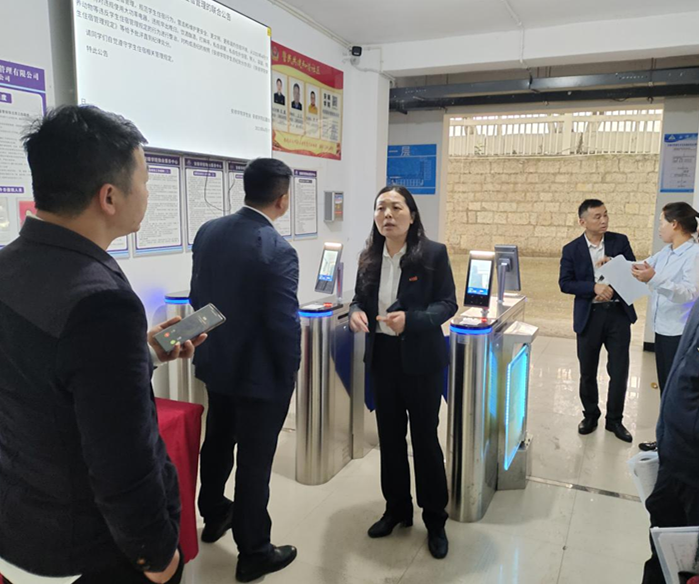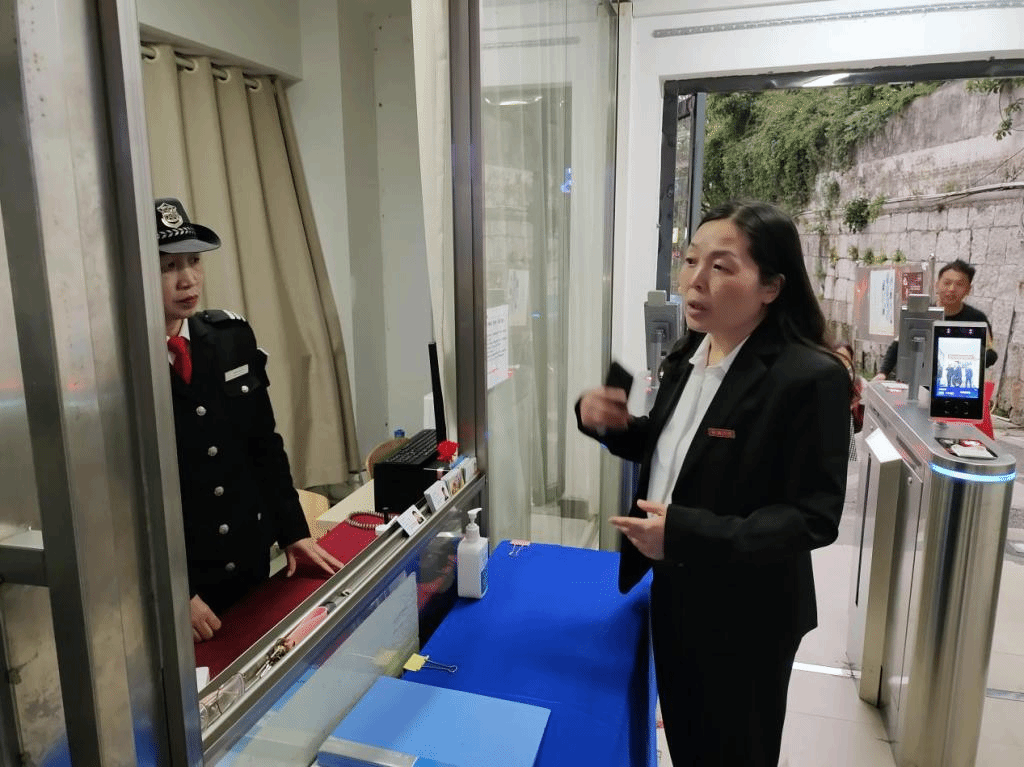 检查组一行对学校门岗进出人员和车辆的身份进行仔细核验