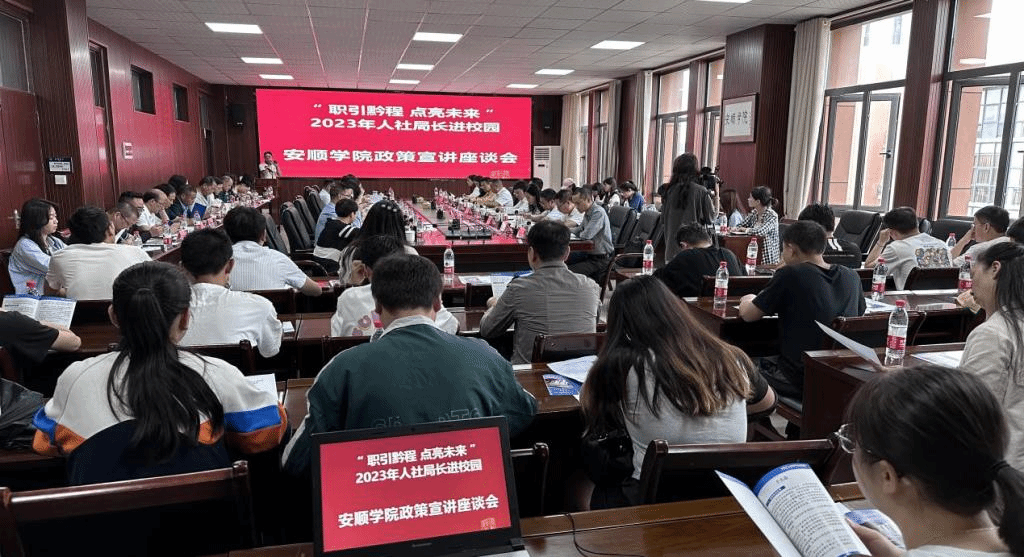 在安道楼第一会议室召开“职引黔程 点亮未来”2023年人社局长进校园暨政策宣讲座谈会。安顺市委组织部副部长、人社局党组书记、局长梁正志一行到